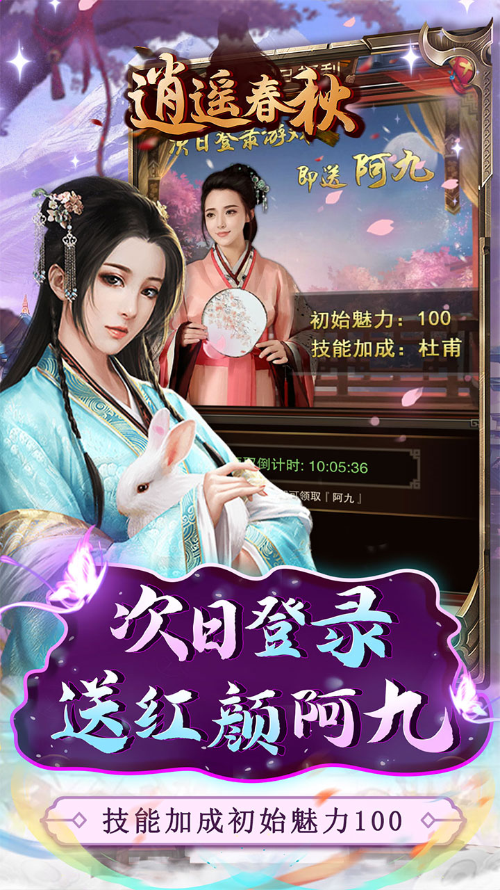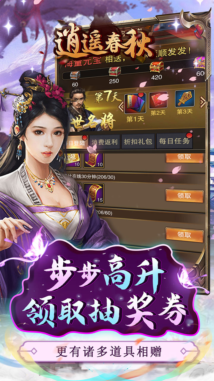 上线即送GM1,粮草*10亿、银两*10亿、士兵*10亿、元宝*1亿、抽奖券*100 1.步步高升每日领取大量抽奖券,科技转盘大额红包等你来 2.上线即送GM1,VIP奖励免费领! 3.登录送豪礼,大展宏图、鹏程万里、前程似锦礼包等你来! 4.次日登陆领红颜阿九,初始魅力100,更有技能加成! 5.跨服活动、联盟冲榜、冲榜活动诸多玩法等你体验